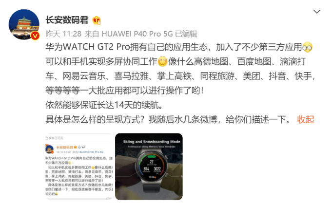 据悉,华为 WATCH GT2 Pro 将支持第三方应用,且手表应用可与手机多屏协同。如手机导航时,手表显示关键信息;手机打车之后,手表显示司机距离和到达时间等等。在此基础上,华为 WATCH GT2 Pro 还能实现两周续航。
