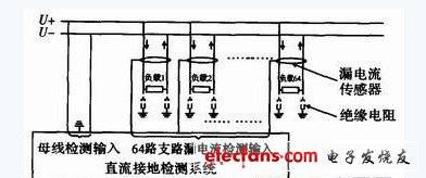 直流供电系统由于长时间在恶劣环境中工作,线路、连接器、接线端子、刀闸等会产生老化,从而导致正负母线的绝缘性能降低,对地绝缘电阻减小,产生漏电电流。漏电流的产生将会引起流入和流出用电负载的电流不一致(部分电流经过绝缘电阻流入大地)。非接触式直流漏电流传感器,能够把流入和流出传感器的直流电流差感应成直流电压。这样在每个用电负载的输入和输出线路上安装一个非接触式直流漏电流传感器,就能检测出每个用电负载或者线路的漏电流。直流接地检测系统则根据漏电流传感器的感应电压求出漏电流的大小。然后通过“平衡-不平衡法”检测出正负母线对地电压,根据母线电压和漏电流求出各个支路绝缘电阻的大小。