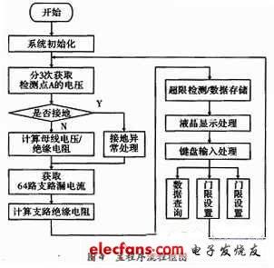 整个程序的编写均由C语言完成,在程序设计中,采用了结构化程序设计方法,使各个模块程序相对独立,便于程序代码的维护、移植和升级。同时,这样分离式的程序设计,降低了代码的调试难度,缩短了调试周期。将与接地故障信息(如母线电压,母线绝缘电阻,支路绝缘电阻,接地支路号等)密切相关的数据放在一个结构体里,便于掉电存储与回放显示。系统的主程序流程图,如图4所示。