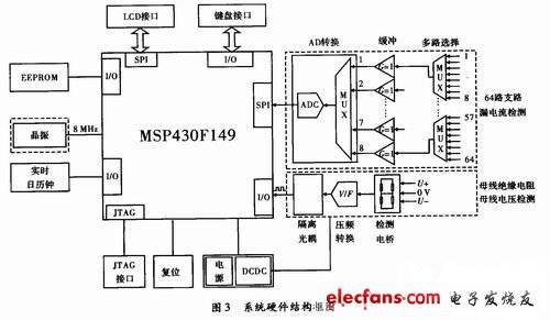 直流接地检测系统采用低功耗处理器MSP430F149为硬件核心,外围电路可分为数据采集模块、人机交互模块、处理器模块。数据采集模块负责检测64路支路的漏电流、母线电压、母线绝缘电阻;人机交互模块负责进行液晶显示和键盘输入;处理器模块负责协调整个系统的数据处理,数据存储,人机交互等。具体的硬件结构框图,如图3所示。