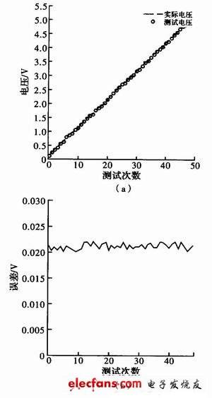 为了达到好的测试效果,A/D采集必须达到一定的测试精度,图5是A/D采集的实测数据和测试误差分析曲线,从图中可以看出,A/D采集的误差约20 mV,属于正常范围,因为系统采用8位A/D,5 V基准电压。这个采样精度满足整体的设计要求。