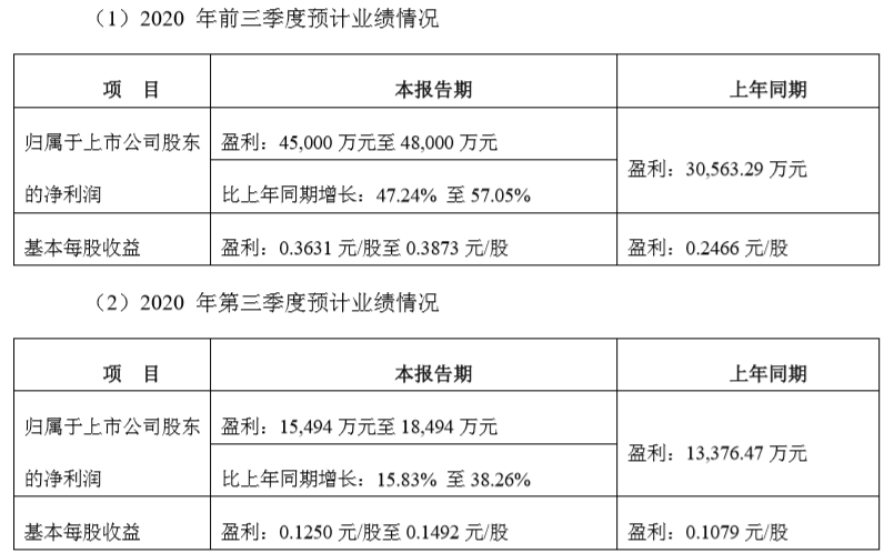 此外,第三季度归属于上市公司股东的净利润预计为15,494万元至18,494万元,同比增长15.83%至 38.26%,基本每股收益为0.1250元/股至0.1492元/股。