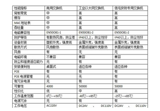 使用工作电压:工业交换机适用DC24V、DC110V、DC/AC220V。商用交换机必须在AC220V下工作。