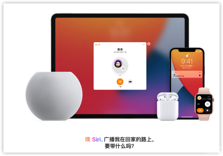 首先,你至少要有一个HomePod mini(当然HomePod也可以),然后可以在其他任何场所使用Apple Watch、iPhone、Airpods甚至Carplay来呼叫家里的HomePod mini,实现广播功能。