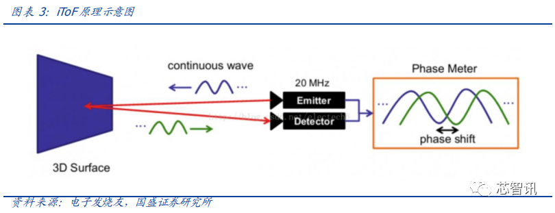 iToF 间接测量飞行时间,具备低成本、较高分辨率优势,适用于短距离测距。iToF 原理为把发射的光调制成一定频率的周期型信号,测量该发射信号与到达被测量物反射回接收端时的相位差,间接计算出飞行时间。由于 iToF sensor 的 pixel 相对较小,可实现相对高图像分辨率。但iToF问题在于的测距精度的实现限制了最大测距距离,从原理上看,调制频率越高则测距精度越好,高调制频率意味着对应的测距距离不能太大,并且环境光会对电路产生干扰。因此目前 iToF 主要应用在手机面部识别、手势识别等测距距离较短的场景中。