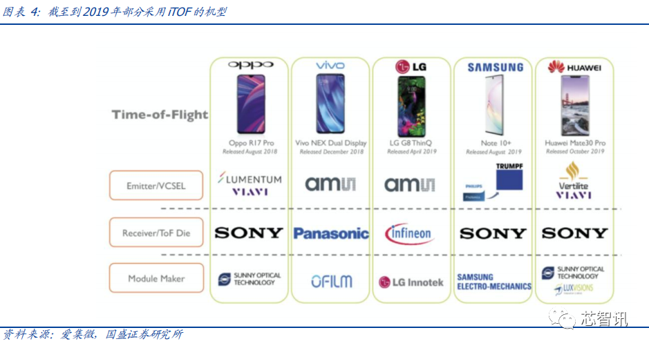 iToF 传感器电路相对简单,难点主要在深度算法,安卓阵营自 2018 年引入 iToF 并推动其主流化。目前如三星、华为、OPPO、vivo 等品牌均有在中高端机型中配臵,除此之外,iToF 在物体识别,3D 重建以及行为分析等应用场景中能够重现场景中更多的细节信息,因此还被广泛应用于机器人、新零售等领域。