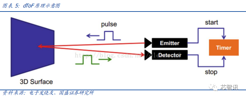 dToF 直接测量飞行时间,具备低功耗、抗干扰等优势,适用于对测距精度要求高的较远距离测距场景。dToF 原理为向被测物体发射光脉冲,通过对反射和发射光脉冲时间间隔的测量,直接计算待测物体的深度。测距原理使得 dTOF 测量精度不会因距离增大而降低,功耗更低同时对环境光的抗干扰能力更强。