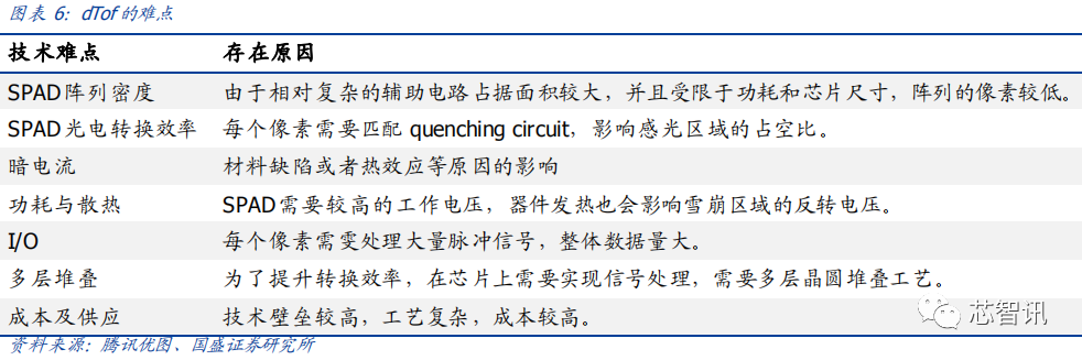 dToF 深度算法相对简单,难点在于用以实现较高精度的 SPAD。dToF 要检测光脉冲信号(纳秒甚至皮秒级),因而对光的敏感度要求会很高,因此接收端通常选择 SPAD(单光子雪崩二极管)或者 APD(雪崩光电二极管)这类传感器来实现,集成度弱于普通的CMOS 图像传感器,像素尺寸一般大于 10μm,从而分辨率通常较差,成本更高。SPAD是 dTOF 技术的核心,技术难度大且制作工艺复杂,目前世界上极少厂家具备量产能力,集成难度很高难以小型化应用在手机等小型消费电子上,因而除传统热门应用领域车载LiDAR 之外,消费电子领域目前仅有苹果一家实现商用(iPad Pro 首次搭载)。
