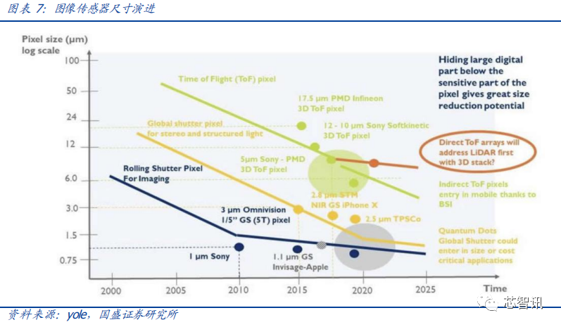 未来 TOF 会向更高集成度、更小的传感器尺寸、更高分辨率发展。目前传统的 CIS 单像素尺寸最小可达到 0.7μm,而目前 0.6μm 也已经在研发中。但 ToF传感器更要求单像素获取信号的能力,因而需要更大的单像素尺寸;dToF 传感器电路设计比较复杂,需占据较大的片上尺寸;iTOF 像素尺寸则需暂时让步于更高的集光效率。种种原因使得 ToF 图像传感器的小型化存在一定困难。