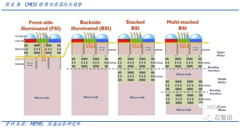 半导体工艺改进将有望实现 TOF 传感器小型化。ToF 传感器厂商通过半导体工艺方案的改进,如背照式(BSI)、堆栈式(Stacked)CMOS 等技术,将原本位于光电二极管上方的布线层移至下方,以及将光电转换器、电子倍增器(electron multipier)这些部分垂直堆叠,增大像素开口率,同时减小像素尺寸。目前根据松下最新的研究成果,dToF 传感器也可以用 CMOS 工艺实现,集成度已经在数量级上逼近 iToF 方案。