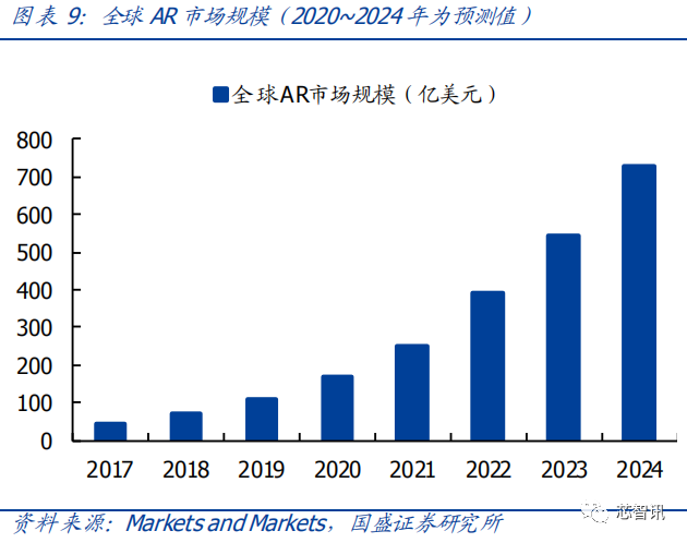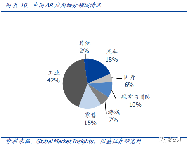 根据 Markets and Markets,2019 年全球 AR 市场规模达到 107 亿美元,预计到 2024 年将达到 727 亿美元,复合增长率达 46.6%。过去几年中,以 Facebook、英特尔、高通和三星为代表的公司在 AR 领域进行了大量投资,推动了全球 AR 市场的快速增长。中国AR 市场规模预计在 2024 年将达到约 59 亿美元,从下游应用来看,工业应用占比最大,约占 42%,其次是汽车(18%),零售(15%)以及航空与国防(10%)等。