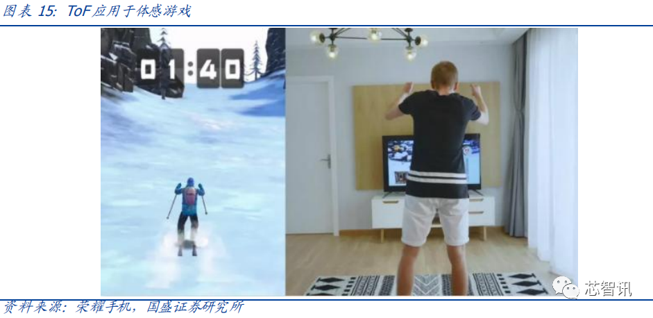 手势识别。目前不少手机具备的悬浮手势识别功能,不用直接接触手机屏幕,仅借由前臵 ToF 的对手势的 3D 感知,通过如在手机前挥挥手这样简单的操作来实现翻页、滚屏等普通操作。体感游戏相比前者更具交互性,通过 TOF 技术能够采集到被拍摄人的身体深度信息,捕捉和采集身体的动作,进行手势判定,控制预制的 3D 建模人偶的形象和动作,实现真人和 3D 虚拟形象跟随,用身体、动作和手势做游戏交互。