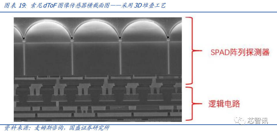 Sony 的 dTOF 方案首次采用 3D 堆叠工艺,像素内连接通过混合键合互连技术将探测器晶圆和逻辑电路晶圆键合实现,同时,深沟槽隔离(Deep trench isolation)也被应用,充满金属的沟槽完全隔离了像素。从而有效控制了 dTOF 传感器的尺寸,使其成功的应用在 iPad 这类小型消费电子设备中。
