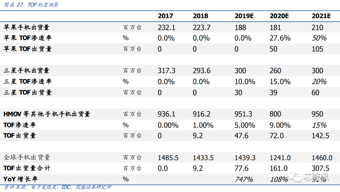我们预测 2019/2020 年 TOF 的出货量为 7760 万/1.6 亿部,同比大幅增长747%/108%。