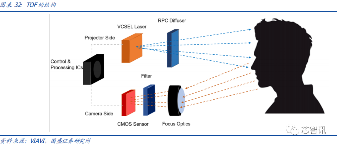 TOF 和结构光二者虽然原理不同,但其所需要的核心部件基本相同,TOF 中的核心部件包括发射端的 VCSEL 光源、Diffuser 等,接收端的镜头、窄带滤光片、近红外 CMOS 等。