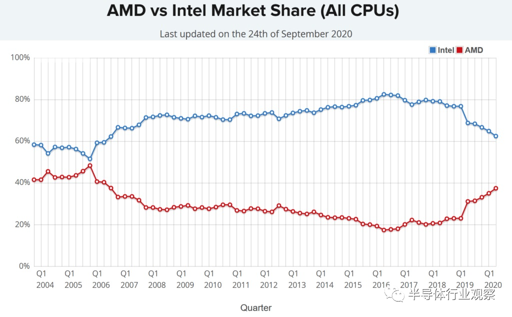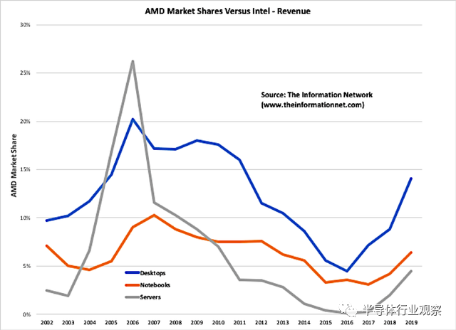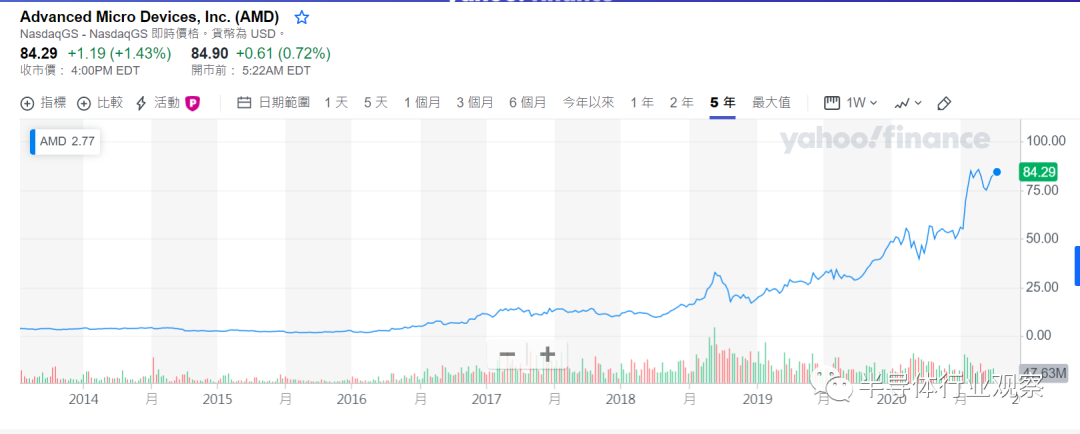 在半导体界,AMD可以说是“翻身农奴把歌唱”的典型代表之一。2015年,AMD每只股价一度保持在2.6美元左右,而如今它已是你隔壁84.29美元高攀不起的“大哥哥”了。经历了资不抵债、亏损多年的低谷,AMD正在半导体CPU和GPU领域以老二的身份顽强的奋斗着。在过去两年里,得益于自己的设计优势还有台积电先进制程的加持,AMD在处理器的地位日益攀升,并逐渐有了叫板Intel的底气。而这离不开其自行研发的Zen架构,如果说AMD这十年最大的动作是什么?研发Zen架构一定榜上有名。再者就是拥抱台积电所带来的转机,此前Lisa Su在Hotchips上曾分享到,AMD CPU产品60%的性能提升来自于晶圆厂。在一份运行PassMark的电子设备的调查报告中显示,十四年来AMD首次夺取了40%的CPU市场份额。其实自2017年基于Zen架构的处理器开始问世,AMD便一直在抢获市场份额,并不断提高。目前x86在消费级市场上主要分为桌面和移动两个部分,其中AMD在桌面版市场上的份额达到了48%。自从锐龙3000系列处理器在去年发布之后,AMD凭借7nm Zen2不断攻城略地,市场份额也水涨船高,从之前的40%一路涨到了48%,差不多半分天下了。2017年6月,AMD重返服务器芯片市场,其第一代EPYC服务器Naples(那不勒斯)横空出世,打破了英特尔多年来在PC市场的垄断,这也显示其重新向数据中心处理器市场发起冲击的决心。而其第二代EPYC罗马被称为“史上最强x86服务器芯片”,相比英特尔Xeno系列处理器,EPYC在性能翻倍的同时,价格也只是对方的一半。苏姿丰此前在接受采访时表示,去年底AMD在X86服务器处理器市场上的份额约为5-6%,到了2020年底的时候这个份额将会提升到10%,这个10%的目标也是平均而言,苏姿丰表示他们在特定领域可能会获得更高的份额。在GPU领域,AMD和Nvidia之间一直存在着一场良性的永恒之战。AMD在中端市场占据上风,英伟达则在高端领域一枝独秀。AMD在价格上多少占有些优势,但英伟达虽然贵但不乏产品性能好。归根结底,这两家公司都依靠相互竞争来繁荣发展。根据GAMINGSCAN的报道,在GPU领域,没有真正的赢家,两者都具有它们擅长的领域和尚待改进的地方。在大多数情况下,AMD在预算和中端显卡方面会更好,而Nvidia是高好的高端显卡。