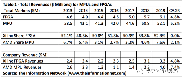 1984年,Ross Freeman和Bernard Vonderschmitt创立了Xilinx,以开发价格更实惠的可编程芯片。这在很多方面改变了半导体行业。快进到2020年,FPGA先驱将自己投入到芯片巨头的运营中,围绕高度可编程解决方案的创新仍在继续。据seekingalpha的分析指出,图1显示了同期AMD的市场份额与Intel的台式机,笔记本电脑和服务器的细分情况。AMD在台式机上的份额接近15%,这是由于AMD在2019年末推出了32核3970X和24核3960X Threadripper处理器。与英特尔最新的i9-10980X CPU相比,它们在视频和3D渲染方面的性能更高。AMD与英特尔的台式机,笔记本电脑和服务器的份额比对(图源:seekingalpha)而在核心业务中,AMD近年来在微弱的MPU市场中(2013年至2019年的复合年增长率为5.2%)在市场上领先于英特尔。2019年Xilinx 52%的FPGA市场份额,领先于英特尔的35%的份额。FPGA收入约占MPU份额的12%。收购Xilinx,AMD可能会迎来MPU市场份额不断增加。让我们来看下Xilinx的FPGA和AMD的MPU收入情况。如seekingalpha所列表格所示,在过去六年中,Xilinx的FPGA市场份额一直徘徊在50%左右,但Xilinx CAGR为0%。相比之下,AMD在整个MPU市场中的份额很小,但后来却有所增加。而将市场份额乘以整体市场可得出两家公司的收入。在这种情况下,我们可以看到两个市场中两家公司的收入大致相同。但是AMD的收入一直以7.4%的复合年增长率增长,而Xilinx的FPGA收入仅以4.8%的复合年增长率增长。Xilinx和AMD的FPGA和MPU的收入情况对比(图源:seekingalpha)对AMD来说,收购的另一大有利之处是Xilinx开始生产更小尺寸的设备。这样做将增加晶圆上的芯片数量,降低成本,并提高芯片的性能。Xilinx将其28nm、20nm和16nm节点生产的产品称为“先进产品”,而所有其他产品都被归入“核心产品”类别。