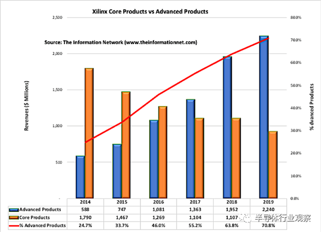 2014年,Xilinx其FPGA收入中只有24.7%是高级产品,而到2019年高级产品占收入的70.8%。2014年至2019年,高级产品的复合年增长率为30.7%,而核心产品的复合年增长率为-12.4%。