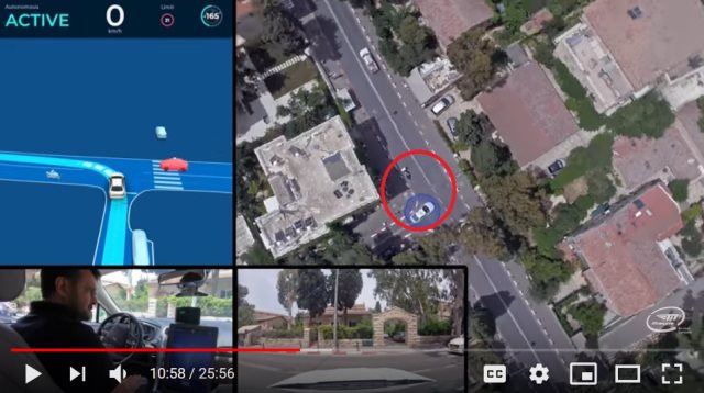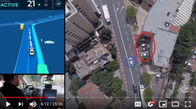 视频都是在耶路撒冷繁忙的街道上拍摄的。每个Mobileye视频显示器屏幕上相同的三个独立的视频元素: 一架Mobileye自动驾驶在耶路撒冷驾驶的无人机镜头,一名安全司机的视图(显示他正在做什么),以及可视化软件,将机器的视图呈现为周围的自动驾驶工具。