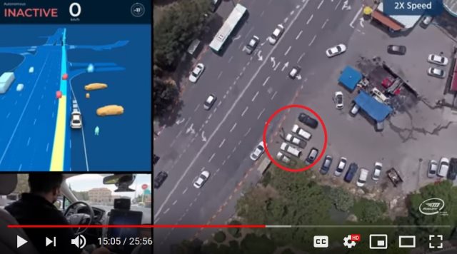 我们所涉及的下一个问题是当Mobileye车辆停下来换电池后会发生什么。顺序大约从14:45开始。在无人机拍摄的视频中,我们看到右侧停着几辆车。但在可视化软件上,停车数量一直在变化。导致这个的原因是什么?