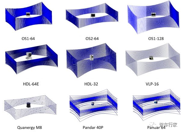 该 Velodyne HDL-64E 具有可比产出率和 0.4 的垂直分辨率°是合理的。缺点是它的重量,尺寸和价格。图 2 显示了一个封闭的矩形空间中不同激光雷达设备的扫描模式,在这些空间中,它们垂直定向而没有倾斜。