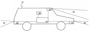 如上图,为装载有控制系统和环境传感器的无人驾驶车辆,图示的车辆安装有三个环境传感器14、16和18,它们向控制系统10发送其采集到的数据和信号。例如,在车辆前进的方向上的传感器14可以检测车辆前方的区域20。
