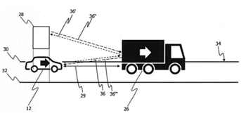 因为无人驾驶车辆发出的雷达波,有一部分会被前车反弹到头顶的路标牌上又反弹回来,再次被无人驾驶汽车所接收,通过这种多次进行雷达波反射,就可与被无人驾驶汽车上的环境传感器14、16以及18所检测到,并提供给控制系统相应的数据,从而让无人驾驶汽车可以理解其所在的位置信息。