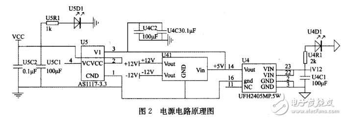 本系统需要使用+5V和+3.3V的直流稳压电源,其中MSP430Fl49及部分外围器件需要+3.3V电源,另外部分需要+5V电源。在本系统中,以+5V直流电压为输入电压,+3.3V由+5V直接线性降压。电源电路原理如图2所示。