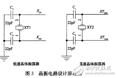 低速晶体振荡器(LFXTl)满足了低功耗及使用32.768kHz晶振的要求。LFXTl振荡器默认工作在低频模式,即32.768kHz,也可以通过外接450kHz~8MHz的高速晶体振荡器或陶瓷谐振器工作在高频模式,在本电路中我们使用低频模式,晶振外接2个22pF的电容经过XIN和XOUT连接到MCU。