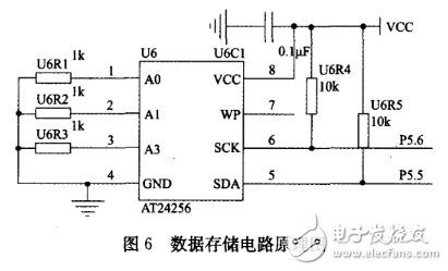 数据存储选择大容量的E2PROMCAT24WC256。它是一个256K位串行CMOS E2PROM,内部含有32768个字节,每字节为8位,CATALYST公司的先进CMOS技术减少了器件的功耗,CAT24WC256有一个64字节页写缓冲器该器件通过I2C总线接口进行操作。原理如图6所示。