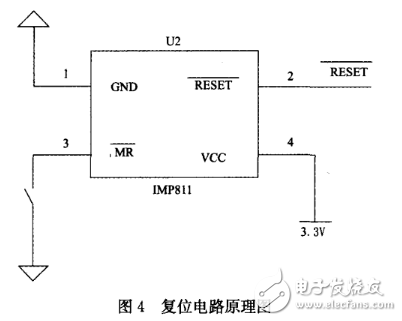 手动复位是最小系统常用的功能,本系统采用专用复位芯片IMP811实现手动复位,原理如图4所示。
