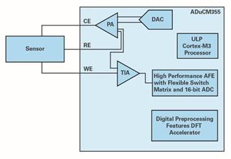 最简单的电流测量方法是对传感器施加偏置电压并测量响应电流。其中,在RE和WE之间施加一个恒定电压,然后使用电流-电压转换器和模数转换器(ADC)将电流剖面转换为数字信号。这个电流剖面取决于传感器和被测变量。图2利用ADuCM355描述了这个电路。