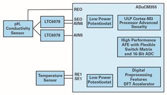 图5.使用ADuCM355测量pH值、温度和电导率的电路