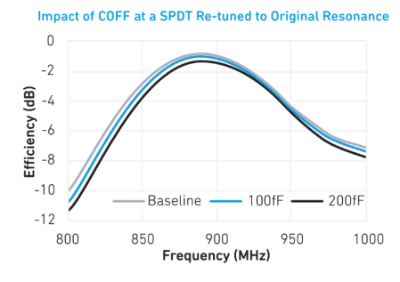 在OFF状态下,孔径调谐器的COFF对天线的电容性负载起作用,降低谐振频率。调谐器的COFF越高,频率偏离天线的自然共振就越多。