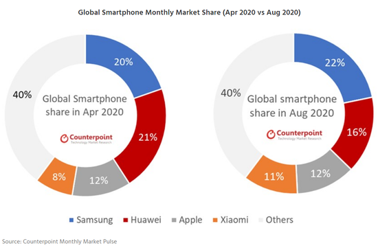 2020年10月21日 | 市调机构:三星7-8月销量反弹,拉大和华为差距