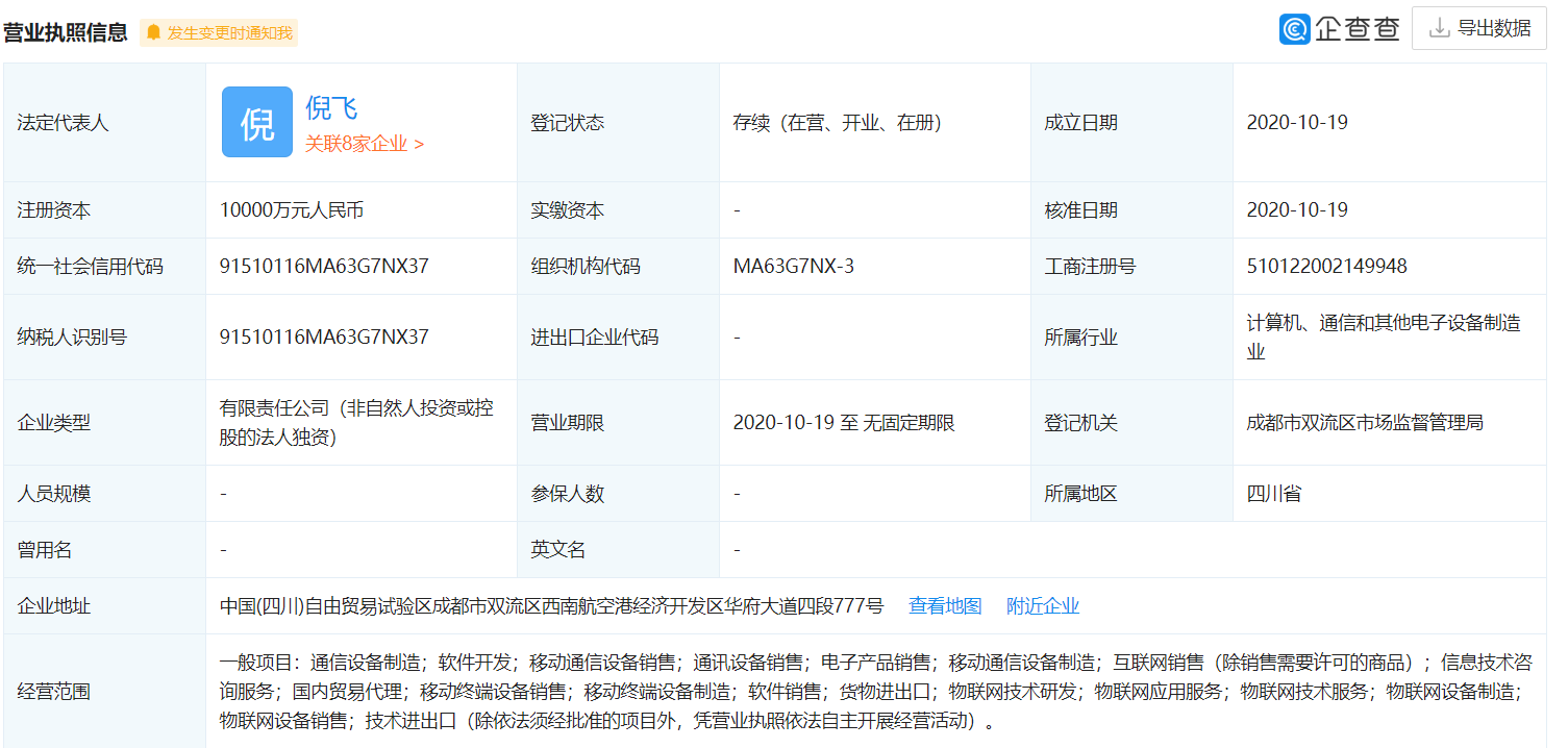 企查查显示,该公司经营范围含信设备制造;软件开发;移动通信设备销售;通讯设备销售;电子产品销售;移动通信设备制造;互联网销售(除销售需要许可的商品);信息技术咨询服务;国内贸易代理;移动终端设备销售;移动终端设备制造;软件销售;货物进出口;物联网技术研发;物联网应用服务;物联网技术服务;物联网设备制造;物联网设备销售;技术进出口(除依法须经批准的项目外,凭营业执照依法自主开展经营活动)。