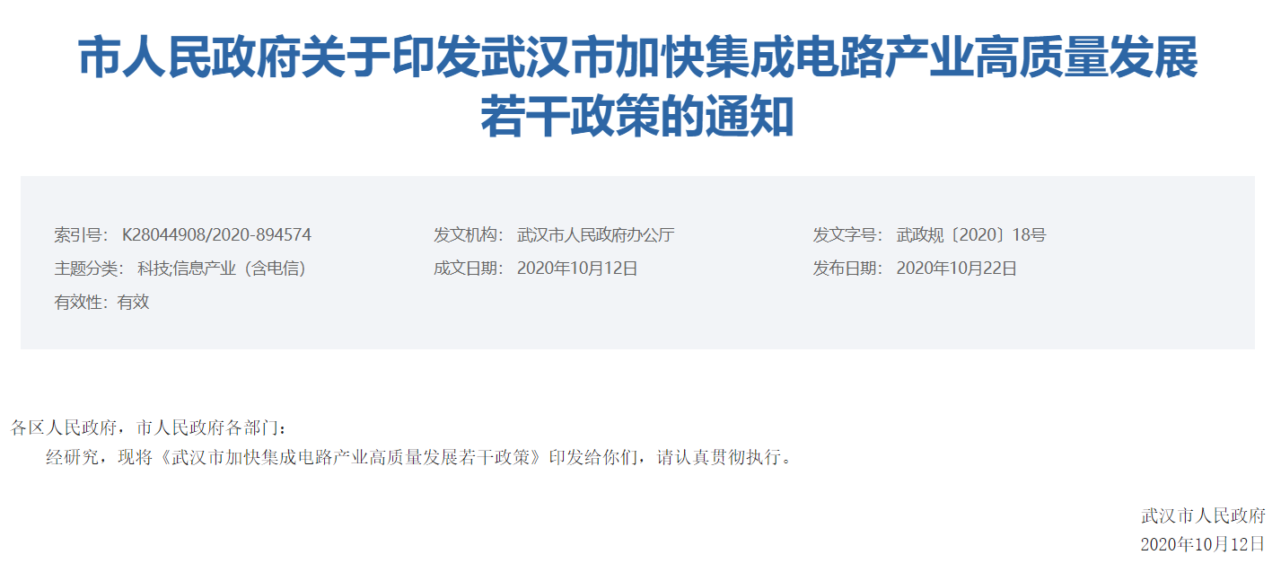 2020年10月22日 | 武汉出台专项政策助推集成电路产业发展,最多扶持1000万元