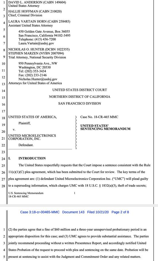 历时近两年的联电被诉窃取美光机密案于近日公开最新进展。加州北部地区法院旧金山分院判决结果显示,联电向美国司法部提出和解解决方案,以期在最短时间内结束本案。联电提出的建议量刑状书包含:请求法院处以轻便的罪名,以及原被告双方协商的罚金美金6000万美元。解决方案尚待法院批准。