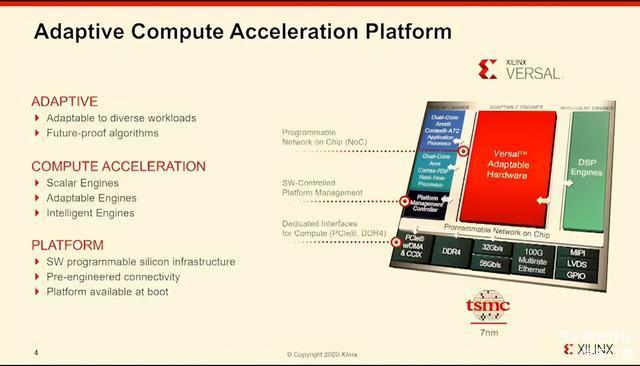 在技术发展上,赛灵思除了保持FPGA方面的优势,还从FPGA慢慢转换到了基于FPGA+AI引擎的SoC结构,并花了超过10亿美元和四年时间来开发自适应计算加速平台ACAP。ACAP是一个高度集成的多核异构计算平台,核心是新一代的 FPGA 架构,适用于加速广泛的应用,其中包括视频转码、数据库、数据压缩、搜索、AI推断、基因组学、机器视觉、计算存储及网络加速等。