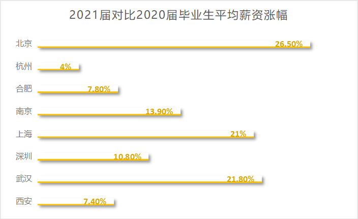 另外,同一个地区,相比2020届,企业也将给2021届硕士毕业开出更高的薪酬,其中,北京地区的涨幅达到26.5%,且涨幅达到两位数的地区还不少。