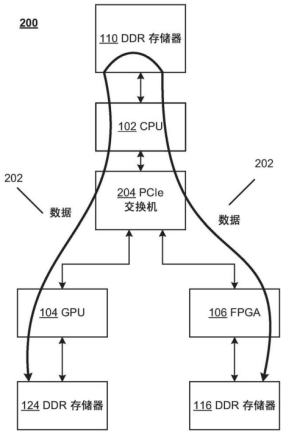 如上图,为GPU和FPGA组件之间间接通信的系统示意图,如图所示,数据202经由GPU、快速PCI交换机、CPU和CPU存储器,在GPU存储器和FPGA存储器之间交换。这是一个间接的路径,由于在GPU和FPGA之间经过了CPU,因此也被称为GPU-CPU-FPGA传输。