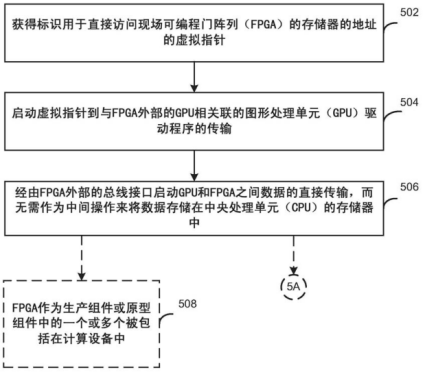 接着,我们来看看GPU和FPGA组件之间直接通信的流程图,如上图所示,首先要获取标识用于直接访问FPGA的存储器的地址的虚拟指针,例如FPGA驱动程序可以生成标识用于直接访问FPGA中的存储器的地址的虚拟指针。