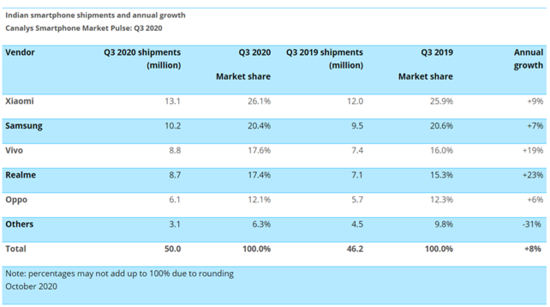 2020年10月24日 | Canalys:小米主导Q3印度智能手机市场,vivo排第三