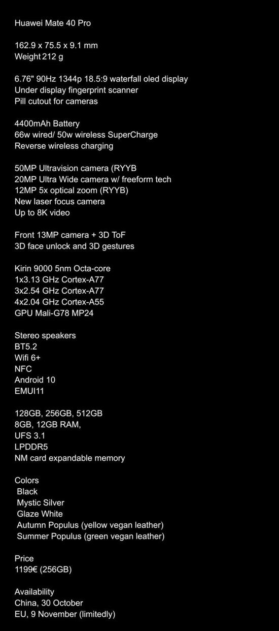 IT之家了解到,爆料显示,华为 Mate40 Pro 机身尺寸为 162.9×75.5×9.1mm,重 212g,采用 6.76 英寸 90Hz 屏幕,拥有 1344P 分辨率与 18.5:9 宽高比,支持屏幕指纹识别。