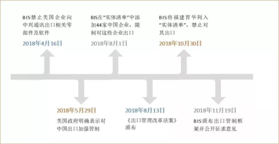 2017年12月18日,美国白宫发布了特朗普任期内第一份国家安全战略报告,将中国列为竞争对手。报告认为中国在和平时期会限制美国在关键商业领域的自由竞争。2018年8月13日美国通过了修改的《出口管制改革法》(“ECRA”)。该法案扩大了美国出口管制制度的适用范围。特别是增加了对美国的“新兴和基础技术”(包括人工智能、机器人、增强现实技术和虚拟现实等14项内容)的出口控制。任何把14项领域的技术转移到中国或其他被视为有国家安全威胁国家的出口行为,都必须获得美国主管机关的核准。同时,美国封锁了中国借由投资来取得美国技术的通道。运用美国专利在中国开发产品,也可能受到管制。上述新规对中国有很强的针对性,很多中国高科技公司赖以生存的芯片将面临新的封锁。
