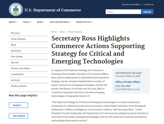 2020年10月26日 | 中国《出口管制法》即将实施,美国再禁六项关键新兴技术