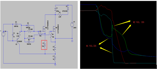 图6 不同源极(M2=10nH,M1=1nH)LTspice仿真开通波形图