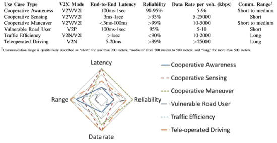 3GPP 和 5G 汽车协会等行业论坛已经确定了 5G V2X 系统在延迟、可靠性和数据速率方面的特定于用例的性能要求。3GPP 确定了 5G V2X 的以下五类要求: