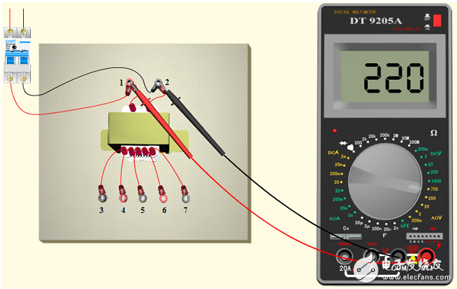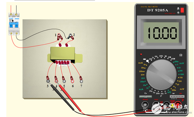 第四步:将万用表挡位旋转至交流电压挡20V量程,分别测量3-4,4-5,6-7各点之间的电压,并记录读数。