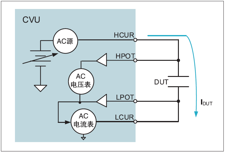 时域AC值被处理到频域中,生成相量形式的阻抗。CVU使用自动平衡 电桥 (ABB)方法测量电容。ABB用来抵消DUT一个端子(如果AC电流表在LCUR上则为LPOT)上已知频率的AC信号,以警戒杂散阻抗。这个AC接地会把CVU的LPOT保持在0VAC,这样测试电路中的所有AC电流都会流到AC电流表,而不会经过测试电路中的任何并联电容。